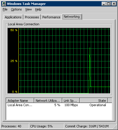 Das Problem trat auf sowohl unter Windows XP als auch unter Windows 7 und unabhängig von Benutzer und Server auf. Während des Öffnes war im Taskmanager eine minimale, aber konstante Auslastung der Netzwerkverbindung zu beobachten: